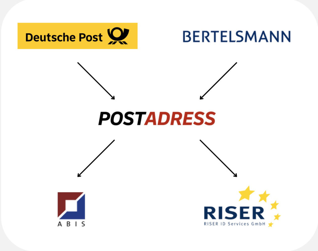 Zwei Tochterfirmen komplettieren unser Angebot an intelligenten Adressmanagement-Services: ABIS in Frankfurt am Main bietet Lösungen zur Personenstammdaten-Pflege. RISER ID Services in Berlin ist Marktführer für elektronische Meldeamtsanfragen im deutschsprachigen Raum.